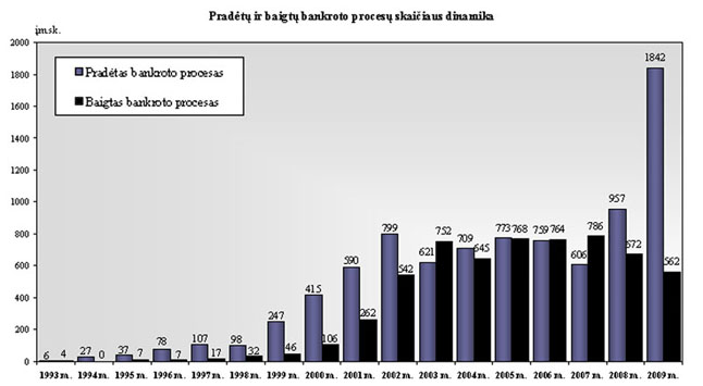 Prie bedarbių gretų didinimo itin sėkmingai pastaruoju metu prisideda ir įmonių bankrotai, kurių irgi fiksuojama žymiai daugiau nei prieš dešimtmetį. Įmonių bankroto valdymo departamento duomenys rodo, kad šalyje per 1999-2003 metus iš viso buvo pradėti 2 672 bankroto procesai. Tuo metu vien pernai šis skaičius siekia 1 842, 2008-aisiais buvo pradėti 957 bankrotai. Pirmą šių metų ketvirtį su bankroto procedūromis teko susidurti 399 įmonėms.