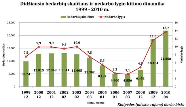 Klaipėdos miesto (rajono) darbo biržos direktorius Andrius Adomaitis sako, jog Rusijos krizės metu nebuvo tokio staigaus nedarbo šuolio kaip dabar - nuo 2008-ųjų pabaigos iki šių dienų bedarbių uostamiestyje ir Klaipėdos rajone padaugėjo net 15 tūkst. O 1999-2003 m. bedarbių gretos buvo išaugusios tik 3 tūkst. Lietuvoje 1999-2002 m. bedarbių padaugėjo 103 tūkst., o nuo 2008-ųjų iki šių dienų - net 260,7 tūkst.
