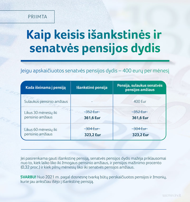 Skaičiuojant išankstinės pensijos dydį bus taikomas mažinimas po 0,32 procento už kiekvieną mėnesį, likusį iki senatvės pensijos amžiaus sukakties arba už kiekvieną išankstinės pensijos gavimo mėnesį. Iki šiol buvo taikomas mažinimas po 0,4 procento už kiekvieną mėnesį, likusį iki senatvės pensijos amžiaus sukakties, o sukakus senatvės pensijos amžių – už kiekvieną išankstinės pensijos gavimo mėnesį.