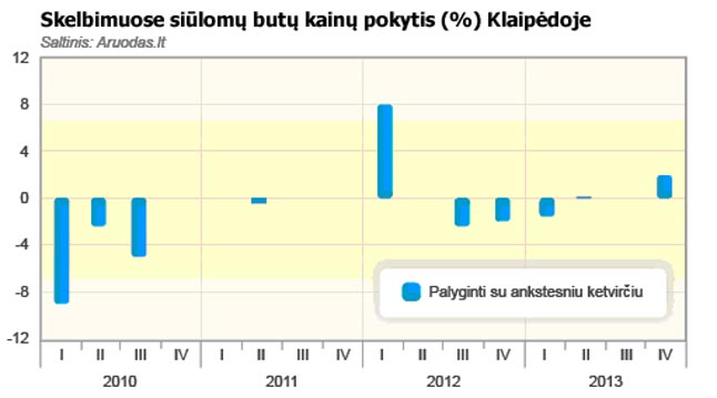 Klaipėdoje dažnai fiksuojamos panašios nekilnojamojo turto tendencijos kaip ir sostinėje, taigi vidutinės skelbimuose siūlomos butų kainos pernai kito taip pat panašiai. Didžiausias pokytis fiksuojamas ketvirtąjį metų ketvirtį, palyginti su ankstesniuoju. Metams baigiantis, butų pardavimui kainos padidėjo, tačiau perpus mažiau nei Vilniuje – vidutiniškai 2 proc., rodo Aruodas.lt duomenys.