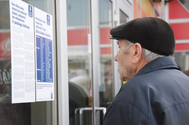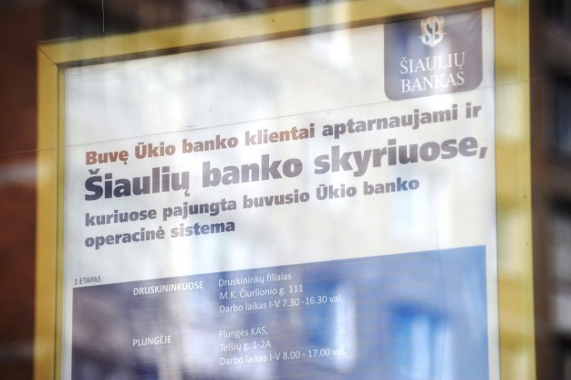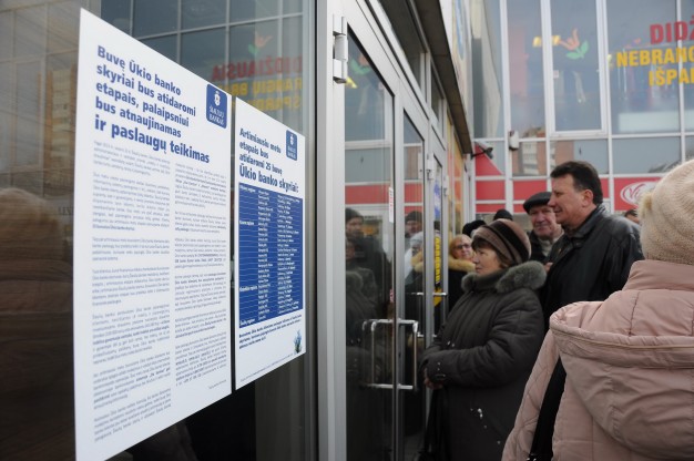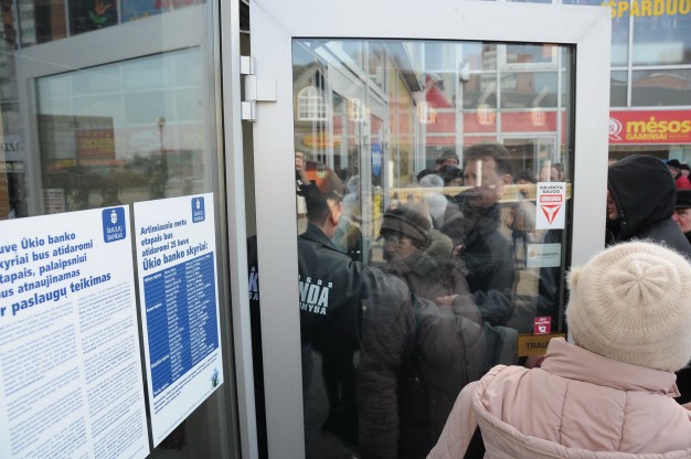 Nuo penktadienio paryčių buvusį "Ūkio banko" skyrių Taikos prospekte užplūdo minios - čia atnaujinus klientų aptarnavimą žmonės eina atsiimti pinigų, atsiimti indėlių bei atlikti kitas finansines operacijas.