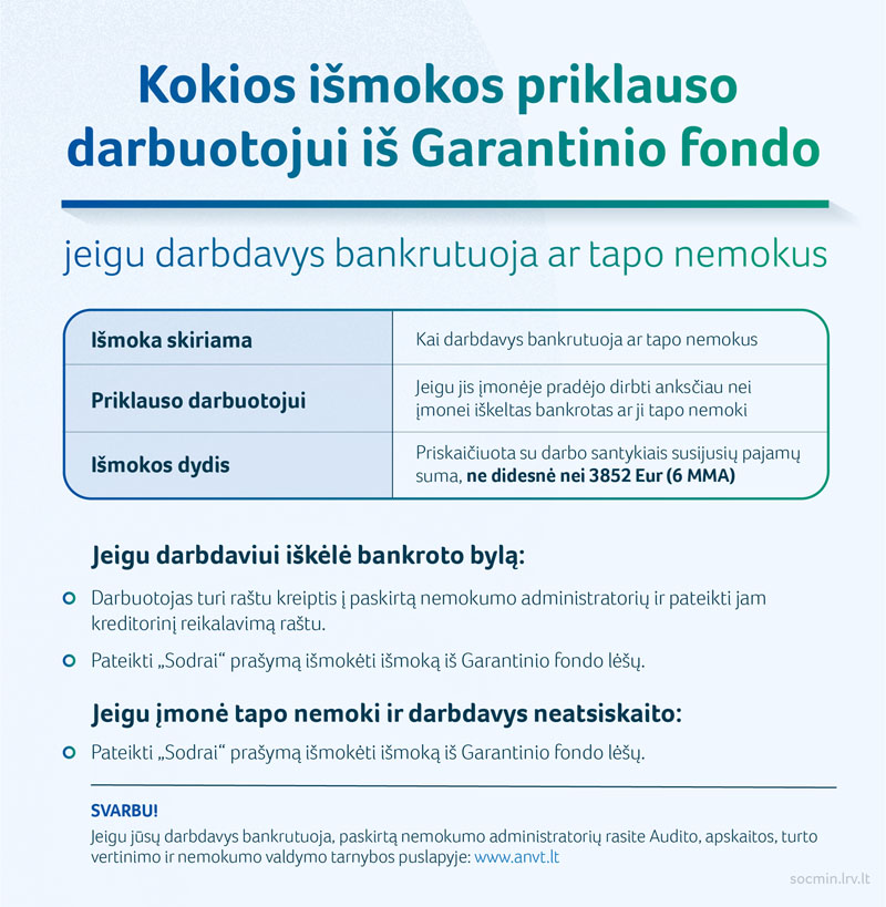 SVARBU. Jeigu jūsų darbdavys bankrutuoja, paskirtą nemokumo administratorių rasite Audito, apskaitos, turto vertinimo ir nemokumo valdymo tarnybos interneto svetainėje: www.anvt.lt.