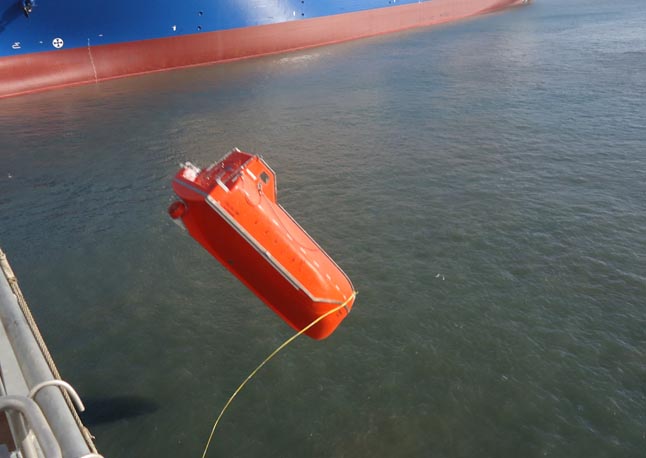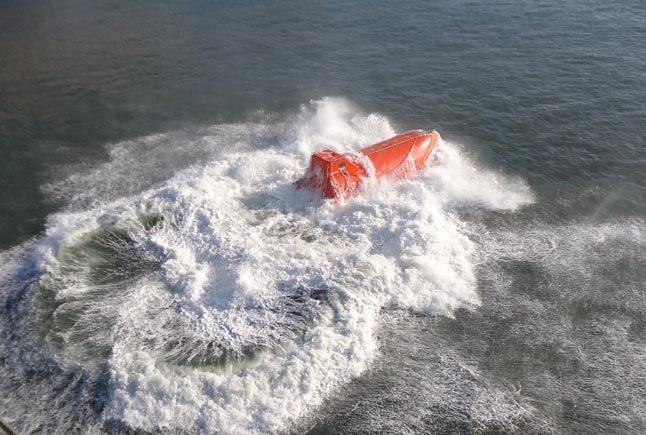 Susirinkusi įgula susėda į gelbėjimo laivą ir staigiai nuleidžiami į vandenį iš 20 m aukščio (apytikriai, kaip iš 7-o pastato aukšto) ir po to plaukdamas 6 mazgų greičiu laivelis nutolsta nuo laivo. Šiame 8,5 metro ilgio, 3 m pločio ir 3,3 m bendro aukščio laive telpa 40 žmonių.