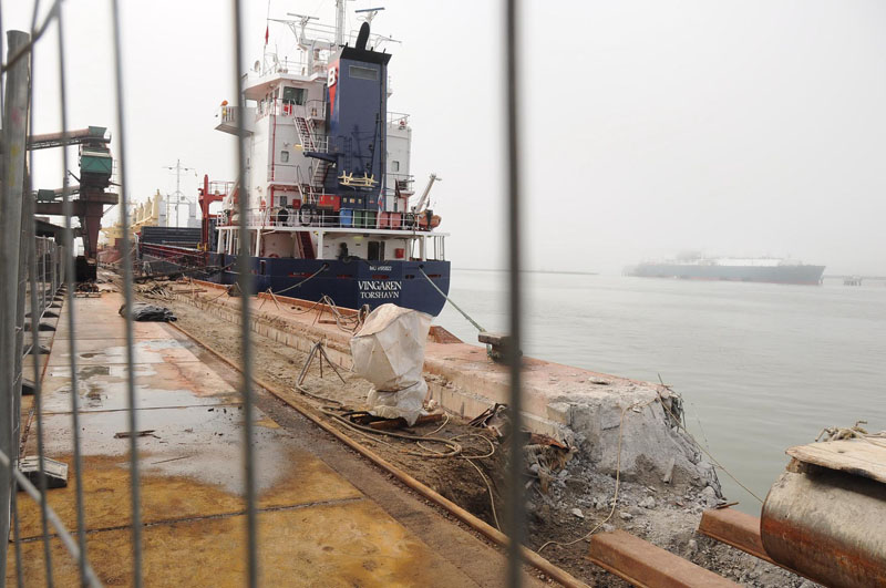 NIEKO BAISAUS. Krantinė, prie kurios stovi laivas, normali. Kadangi reikia derinti rekonstrukcijos ir krovos darbus, dirbama etapais. Kai bus baigta 101 krantinė, tada bus ardoma 102 krantinės danga ir ten vyks darbai. Eimanto Chachlovo nuotr.