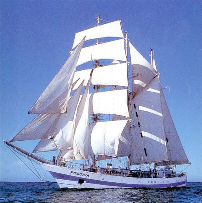 LENKIJOJE 1980 m. pagamintu burlaiviu "Pogoria" atplaukė 52 žmonės (iš jų 40 - praktikantai). STAP (marinetraffic.com) nuotr.