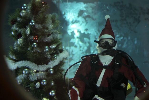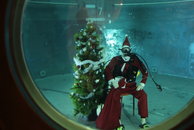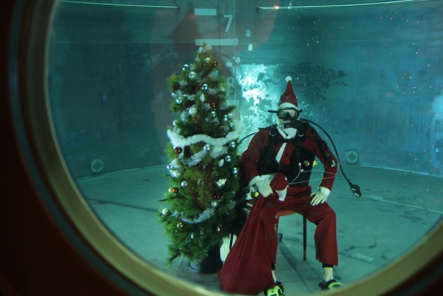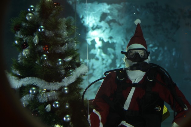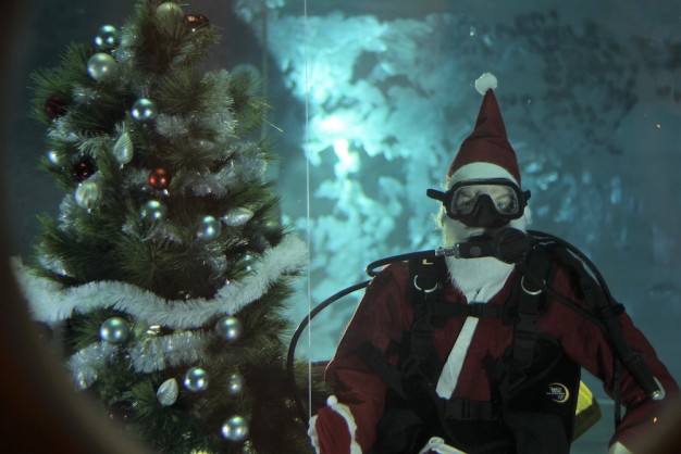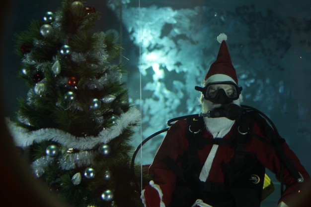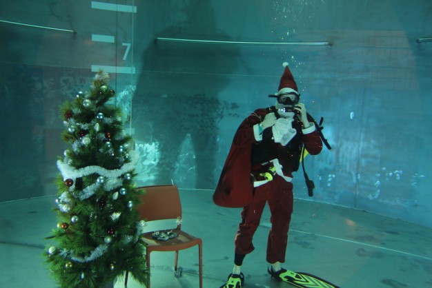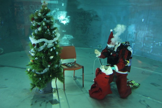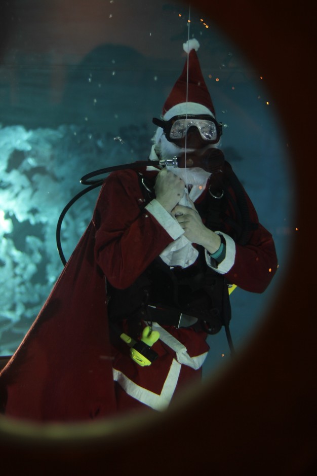 Kalėdų senelis po vandeniu, į 9 m gylį šachtoje panardinta puošni eglutė, po kuria mažųjų plaukikų laukė įspūdingo dydžio dovanų maišas.