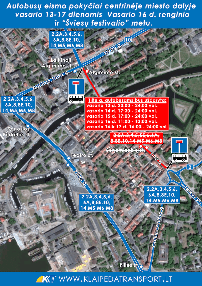 Šeštadienį, vasario 16-ąją, Tiltų gatvė bus uždaryta du kartus: nuo 11 iki 13 valandos dėl Vasario 16 dienos renginio Atgimimo aikštėje ir eisenos, bei nuo 16 valandos iki nakties dėl Šviesų festivalio.