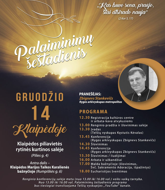 Klaipėdoje vyksiančiame Palaiminimų šeštadienyje tema „Kas buvo sena, praėjo, štai atsirado nauja“ konferencijas ves ypatingas svečias – Rygos arkivyskupas metropolitas Zbignevs Stankevičs. Gros jaunimo šlovinimo grupė „Dėl Tavęs“, o taip pat jungtinis Klaipėdos atsinaujinimo dienų choras, vadovaujamas pianistės Audronės Juozauskaitės. Kad šeimos su mažamečiais vaikais galėtų pilnavertiškai dalyvauti programoje, tėvų patogumui renginio metu, nuo 13 val. iki 16 val., veiks vaikų tarnyba. Užsiėmimus vaikams ves įvairių meno sričių specialistai, jaunimo ir tėvų savanoriai.