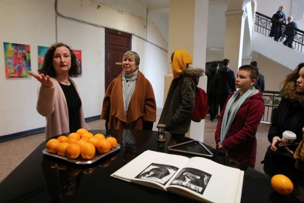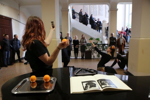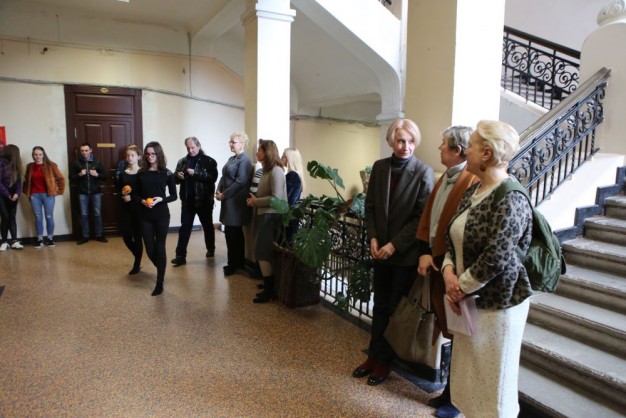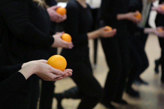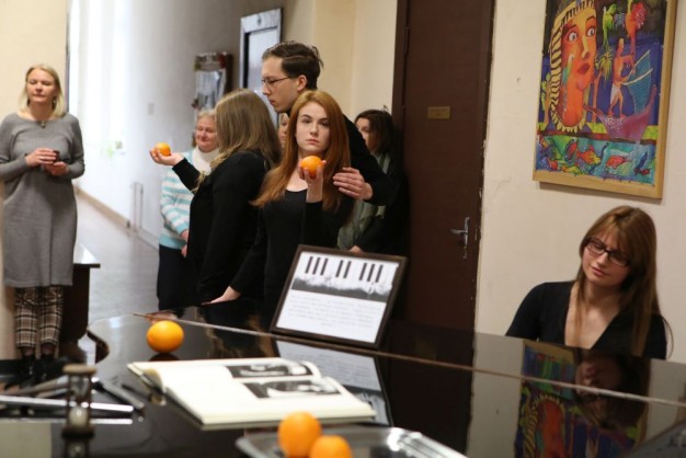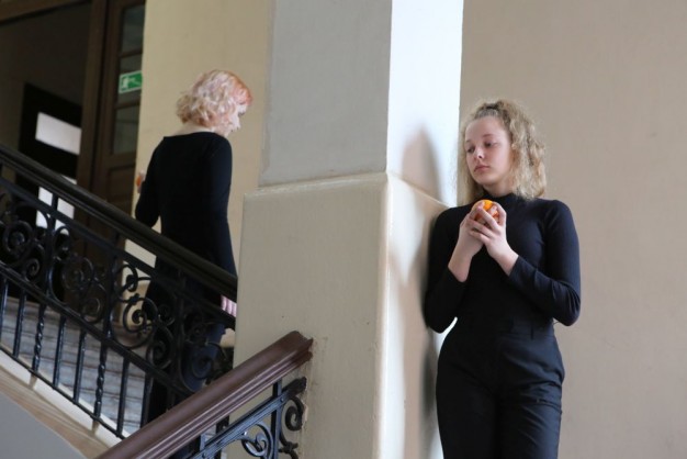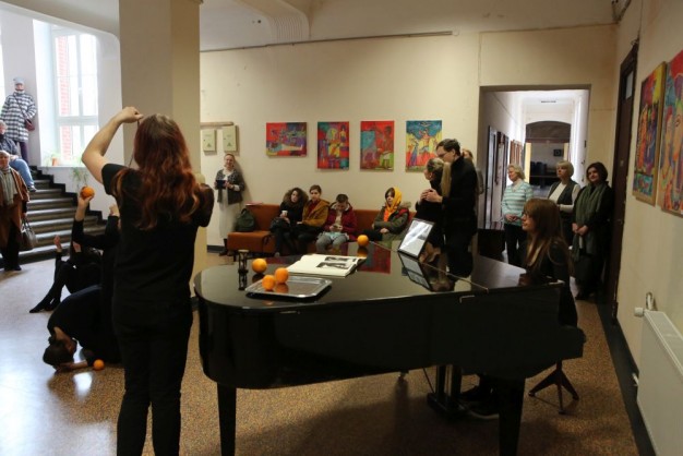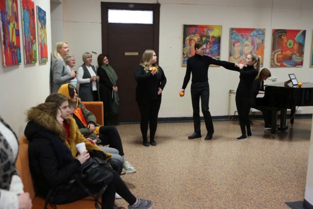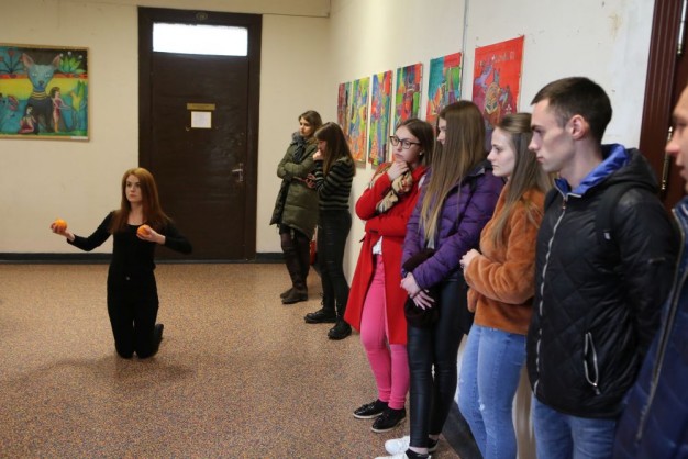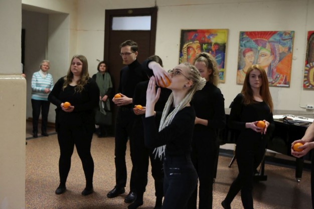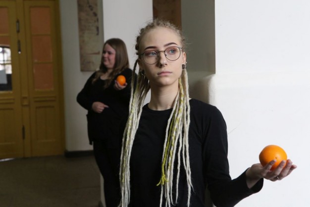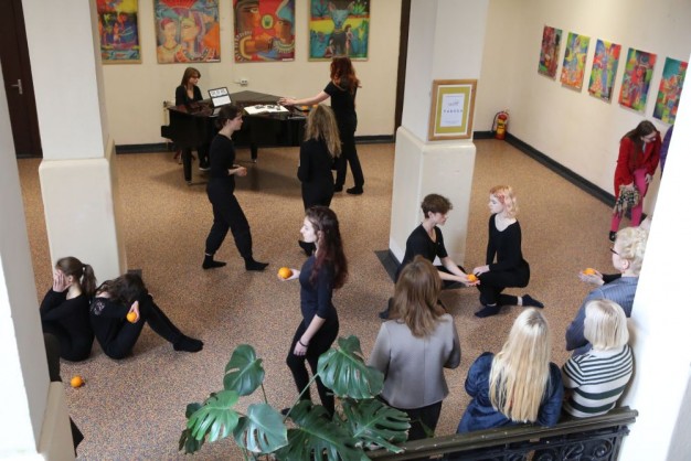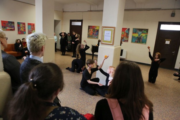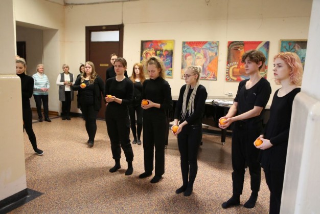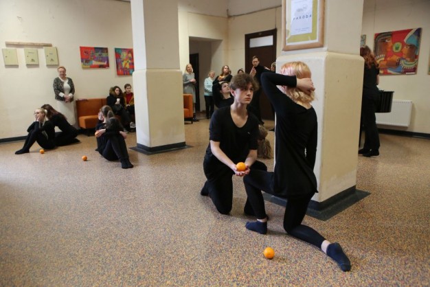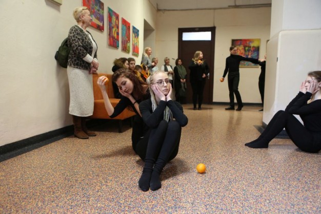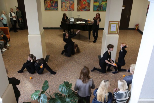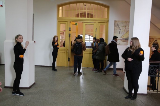 Improvizacija Teatro dienai prasidėjo moksleiviams ir studentams išsirikiavus nuo įėjimo į fakultetą iki antrojo aukšto fojė. Juodai apsirengę jaunieji aktoriai įkūnijo sustingusias statulas, rankose laikančias apelsinus - tarsi aliuzija į grafikos darbus.