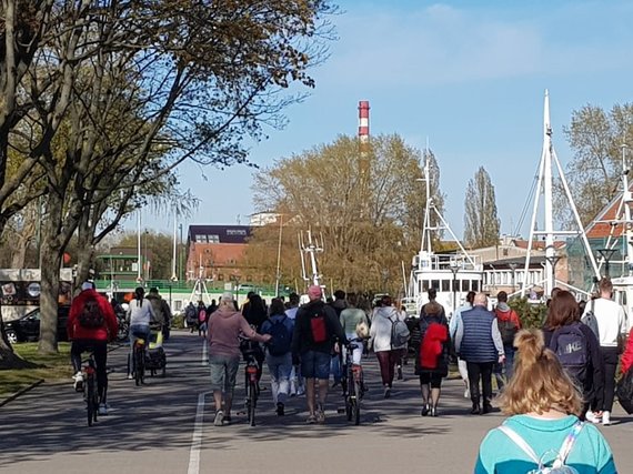 Keltai į Smiltynę iš Senosios perkėlos žmones plukdo kas valandą. Sekmadienį, kai oras Klaipėdoje įšilo iki 18 laipsnių, klaipėdiečiai traukė į pajūrį. Tačiau norinčiųjų buvo tiek, kiek šiltą vasaros dieną. Išlaikyti saugų rekomenduojamą atstumą – neįmanoma. Žmonės, nors ir su kaukėmis, turėjo jas, panašu, tik dėl to, kad tai privaloma: dauguma kaukes laikė ant smakro, burną ir nosį atidengdami.