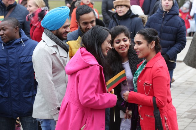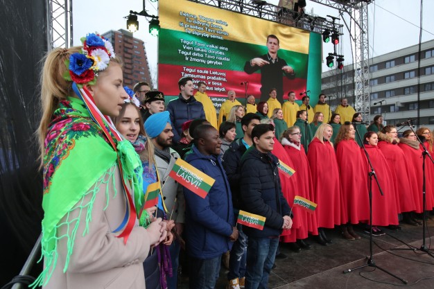 Po to į sceną buvo pakviesti Klaipėdoje gyvenančių tautinių bendrijų ir įvairių tautų atstovai, kurie savo kalba sveikino susirinkusiuosius su švente ir deklamavo pirmąsias Lietuvos Respublikos himno eilutes. Scenoje skambėjo latvių, rusų, ukrainiečių, lenkų, armėnų, azerbaidžianiečių, hidiš, hindi, bengalų ir kitos kalbos. Valstybine kalba sugiedoti "Tautinę giesmę" visiems šventės dalyviams padėjo Klaipėdos universiteto mišrus choras "Pajūrio aidos", vadovaujamas Algirdo Šumskio.