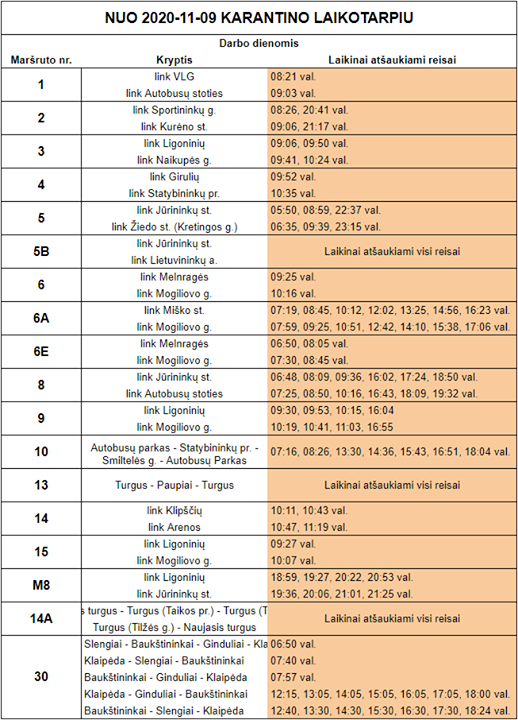 Nuo pirmadienio, lapkričio 9 dienos, dėl karantino optimizuojame autobusų ridą mieste. Daugelyje maršrutų mažiname reisų skaičių, o kai kuriuose net laikinai nutraukiame autobusų kursavimą (žr. pridedamą lentelę).