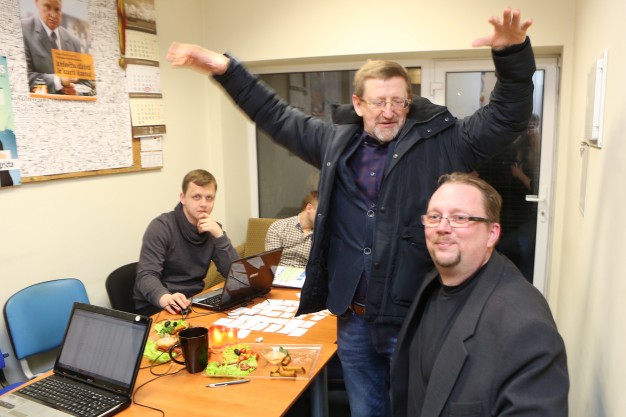 Vytauto Grubliausko partijos būstinėje vyravo kur kas smagesnės nuotaikos. Apie 22 val. praktiškai jau buvo aišku, kad už jį balsavo apie 75 proc. rinkėjų. Pats meras pergalės dar nešventė, nes , pasak jo, kartais viena minutė daug ką keičia. Jis prisipažino, kad vis dėlto debatai, kai reikia kautis su dailiosios lyties atstove, šiek tiek skyrėsi nuo tų, kai aponentai būna vyrai.