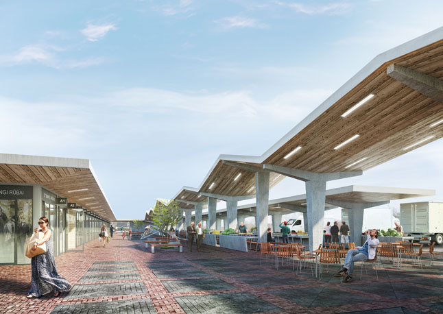 M. Olšauskas pasakojo, kad turgaus aikštėje akcentu taps aiškiai matomas laikrodžio bokštas, taip pat joje turėtų būti vaikų žaidimo aikštelė ir nedidelė poilsio zona su medžiais. Lauko prekyvietė ir dalis alėjos bus dengiama stogu, išsaugomas turgaus po atviru dangumi principas. Stogui pasirinkta laužytų formų architektūrinė išraiška, pabrėžiama dinamiška atmosfera. Stogas dviejų lygių, taip įleidžiama daugiau natūralios šviesos, kartu apsaugoma nuo kritulių.