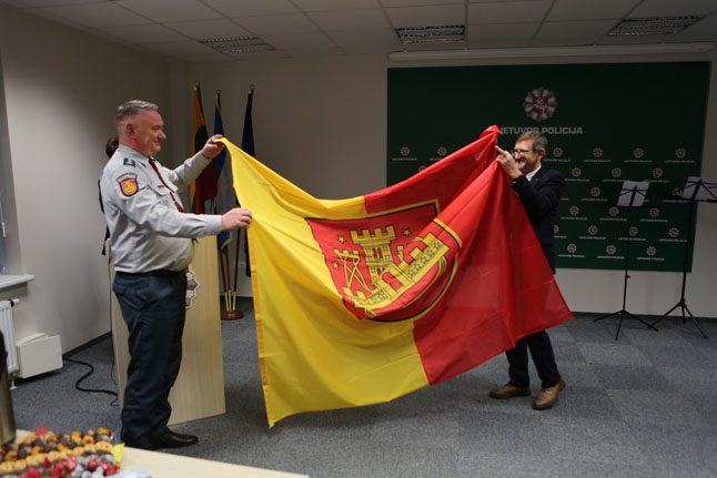 A. Šulcas mero vardu komisariato viršininkui A. Motuzui įteikė Klaipėdos miesto vėliavą, primindamas, kad Klaipėda pasitiki savo pareigūnais.