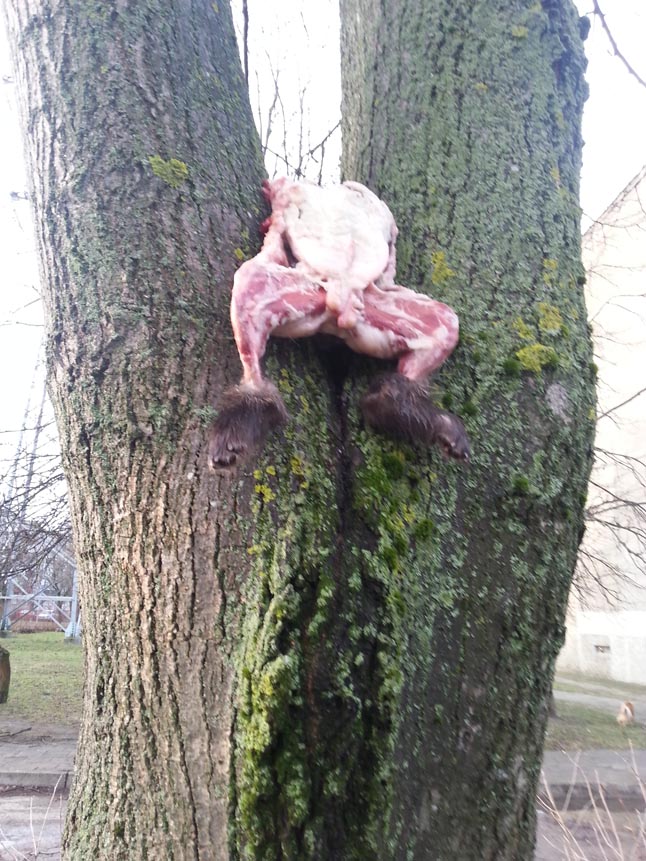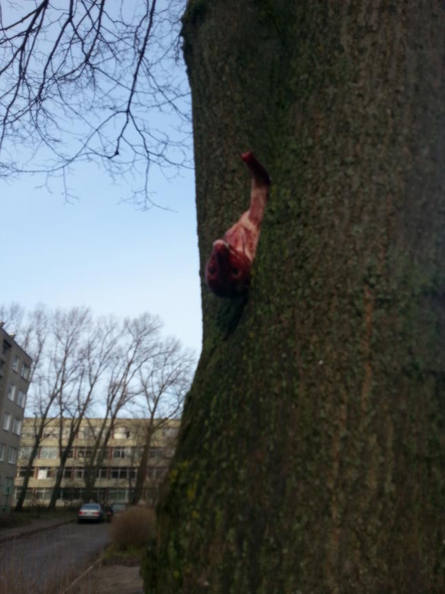 Į redakciją kreipęsis šiaurinės miesto dalies gyventojas Justas atsiuntė dvi šokiruojančias nuotraukas, kuriose užfiksuotas medyje kabantis gyvis nudirta oda. Itin žiaurus vaizdas gąsdino į mokyklą keliaujančius vaikus ir aplinkinių namų gyventojus.