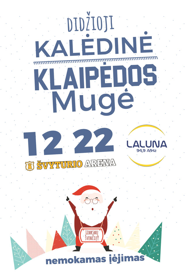 Šį šeštadienį ,,Švyturio areną’’ drebins laukiamiausias uostamiestyje šventinis renginys - ,,Didžioji kalėdinė Klaipėdos mugė’’. Vienai dienai po ,,Švyturio arenos’’ stogu susiburs virš 250 prekybininkų ne tik iš Lietuvos, bet iš Latvijos. Renginys siūlys nuo maisto iki tekstilės gaminių. Nemokama mugė vyks nuo 10 iki 18 valandos ir sutrauks tiek didelius, tiek mažus. ,,Didžiojoje kalėdinėje Klaipėdoje mugėje’’ bus galimybė pakuoti dovanas, veiks ir specialios nemokamos kalėdinių dekoracijų dirbtuvėlės, o mažieji galės žaisti stalo žaidimus.