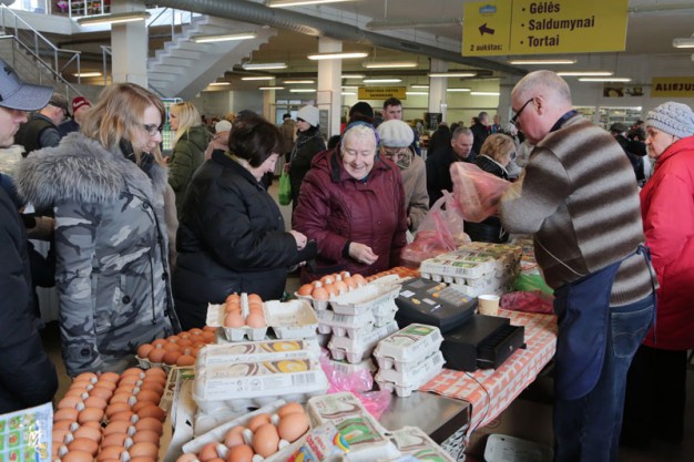 Žalių baltų kiaušinių Naujajame turguje nedaug buvo. Matėsi lenkiškų, kurių dešimt kainavo 1,55 euro. Senajame turguje vyras turėjo baltų estiškų, kainavusių po 1,50 euro. Pasak jo, ką padaryti, kad lietuviai neturi baltų kiaušinių.