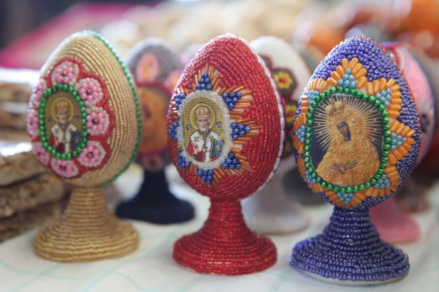 Ponas Adverdas daro ir spalvotus medinius kiaušinius. Darbo prie jų nemažai - reikia medį parsivežti, ištekinti. Vyras didžiuojasi, kad jo raštai gražūs, o ukrainiečiai buvo atvežę parduoti mugėse margintų tik brūkšneliais. Jo šeimos stilius visai kitoks - kiaušiniai yra graviruoti, stengiamasi daryti taip, kaip tautodailininkai. "Ir dažydami vašku mes ne brūkšniukus dedame, o rašome. Tai ypač sudėtinga. Kiti žmonės moka tik pabraukti, o parkerio, kad galėtų rašyti vašku, neturi. Man labai smagu, kad daug žmonių aplinkui džiaugiasi mūsų darbu. Ir vaikų darželius aprūpiname. Labai daug išdovanojame, gal kokį pusę tūkstančio kiaušinių, likusius nuperka", - pasakojo pašnekovas.
