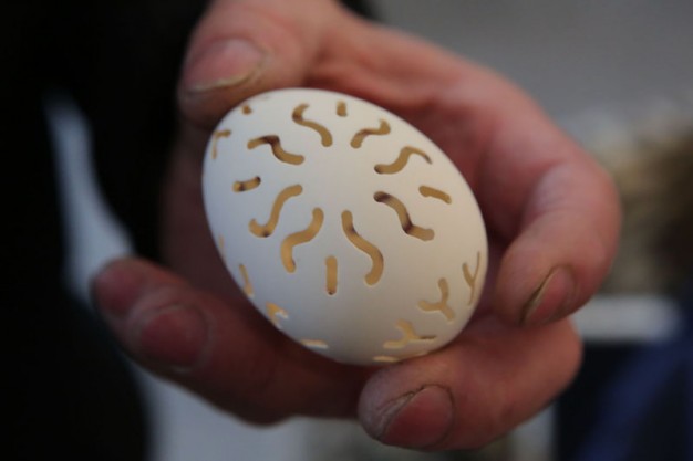 Jis išpjausto kiaušinių lukštus. Ne tik padaro skylutes, bet ir gana sudėtingus raštus. "Išpjaustęs tuščiavidurius kiaušinius vežu į Vilniaus "Akropolį" parduoti. Bet ten labai dideles kainas užsideda, o čia, Klaipėdoje, parduodame iš pirmų rankų pigiau", - sakė jis.