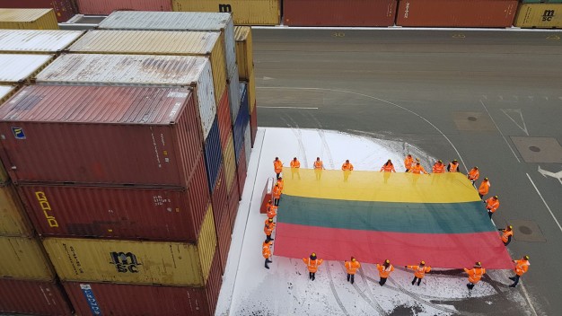 Tikrai ne kasdien uoste pamatysi didžiulę trispalvę, kabančią tarp kranų arba ant kelto nosies, o juo labiau 100 metrų ilgio trispalvę, išdėliotą iš spalvotų konteinerių. Uostas minėti Lietuvos valstybingumo atkūrimo šimtmetį jau pasiruošęs. Skaičiuojant ir stovinčius laivus, jame plevėsuoja iki 100 trispalvių.