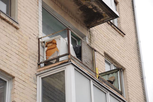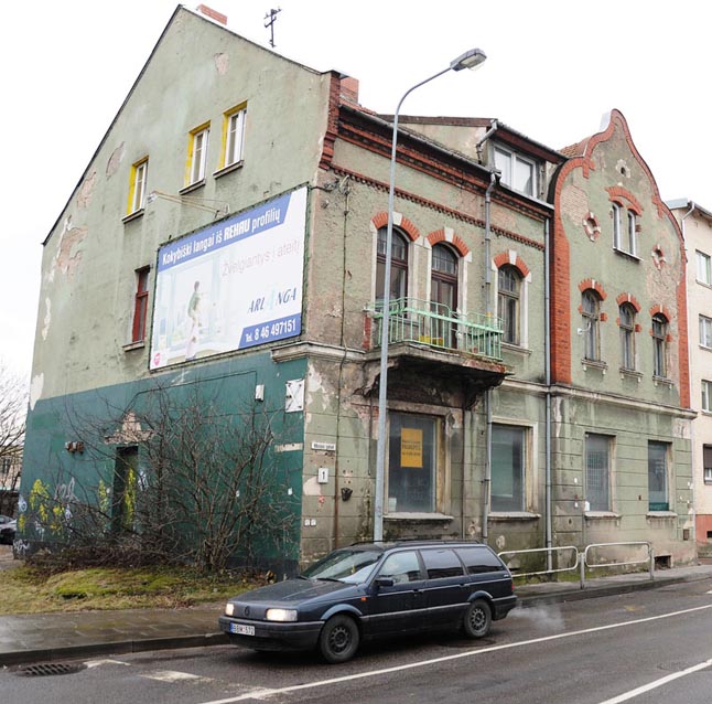 BALKONAI. Viena iš kiemo puošmenų - numerio neturintis bendrabučio tipo namas su apleistais, baigiančiais nukristi balkonais.