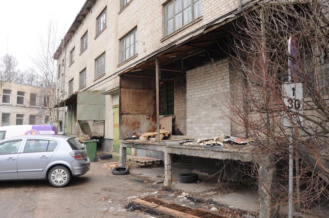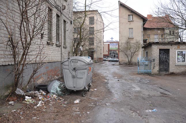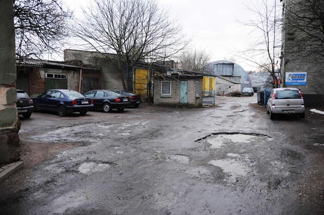 Už tų dviejų minėtų namų - kiemas, primenantis kokios nors gamyklos "užkulisius". Ten ir visokių neva sandėliukų, garažų ir kitokių apleistų pastatų. Iškabos byloja, kad čia teikiamos ir autoserviso, ir minkštų baldų remonto paslaugos, čia yra ir spalvotojo metalo supirktuvė, ir šaldymo bei kondicionavimo įrangos dalių parduotuvė. Netrūksta čia ir šiukšlių bei stovinčių įvairių automobilių. Susidaro įspūdis, kad tai visiškai užmirštas ir apleistas kampelis.