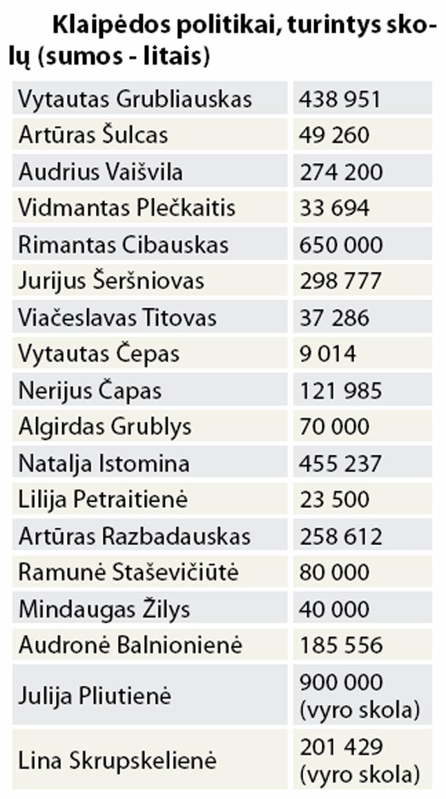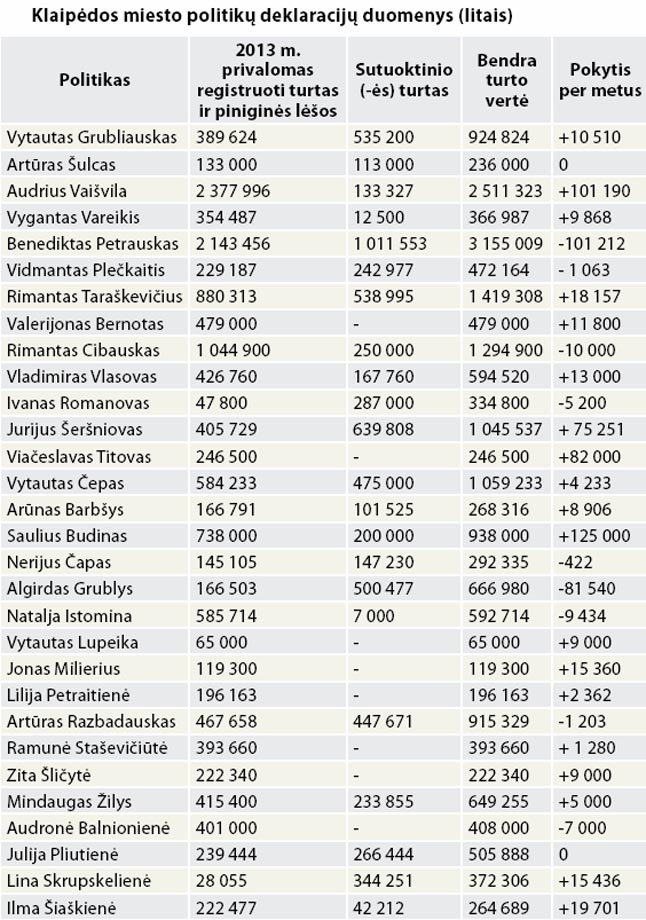 2013-ųjų politikų turto ir pajamų deklaracijos rodo, kad Klaipėdos valdžioje padaugėjo milijonierių - į jų gretas po metų pertraukos sugrįžo Lietuvos rusų sąjungos narys Jurijus Šeršniovas. Kai kurie politikai praturtėjo dešimtimis ar šimtais tūkstančių.