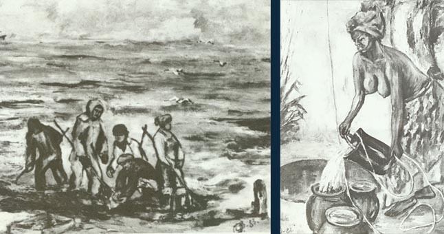 | Petras Petravičius tapė ne tik lietuviškus, bet ir svečių šalių peizažus. Čia - "Banginių medžiotojų kaimelis", tapytas 1977 m., o greta - "Afrikietė prie šulinio", tapyta 1972 m. |