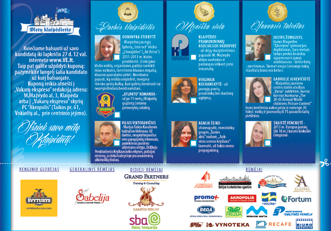 Balsavimas vyks "Vakarų ekspreso" svetainės www.VE.lt skiltyje "Konkursai" (iš vieno IP adreso bus galima balsuoti kas 10 minučių) ir pristatant ar atsiunčiant kuponą į "Vakarų ekspreso" redakciją (M. Mažvydo al. 3, Klaipėda) bei Klientų aptarnavimo skyrių PC "Akropolis" (Taikos pr. 61, Vokiečių al., prie centrinio įėjimo).