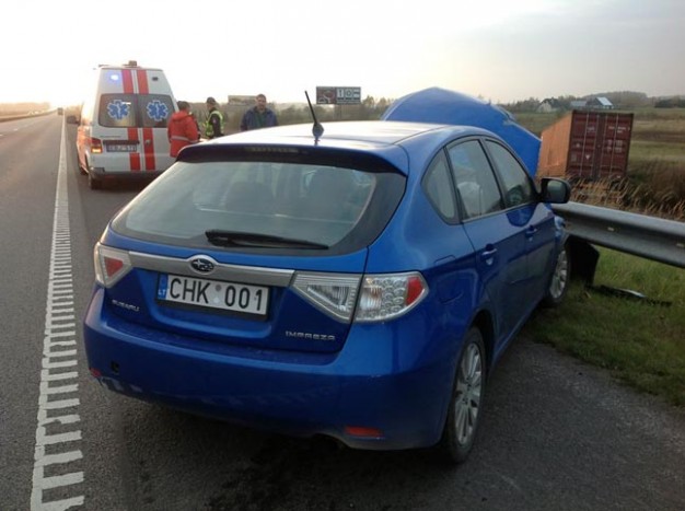 Automobilis "Subaru Impreza", atsitrenkęs į vilkiką, dar atsimušė į atitvarus.