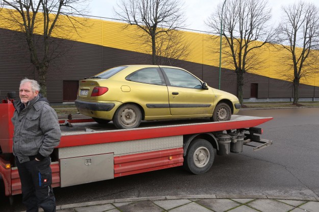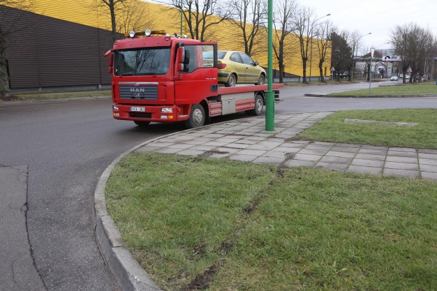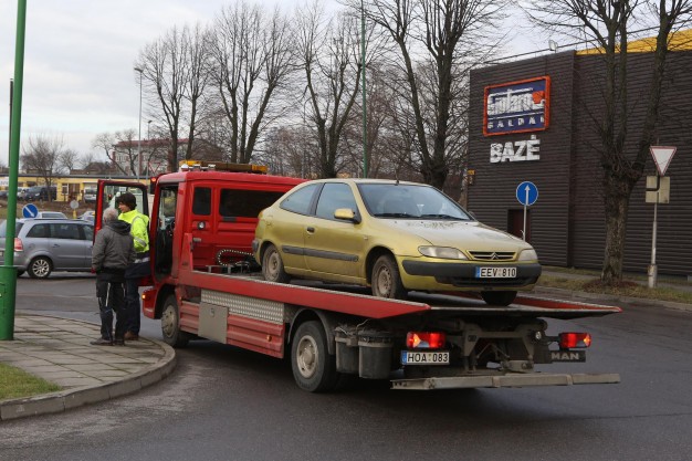 Moters automobilį išvežė techninės pagalbos evakuatorius.
