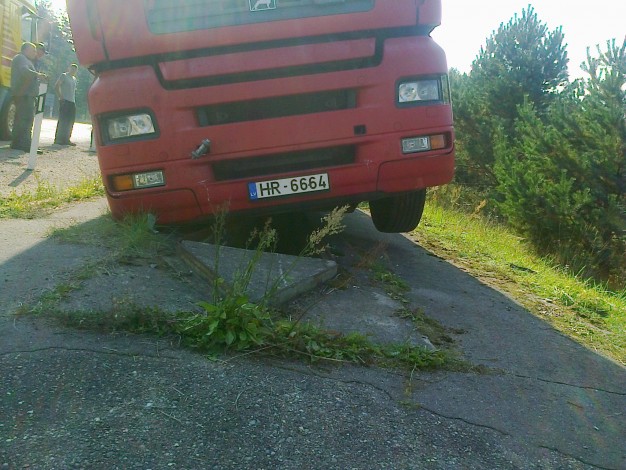 Apžiūrėjęs važiuoklę, Aivars vis dėlto nusprendė vykti į Rygą. Išlipo iš duobės, sėdo į vilkiko kabiną, nespėjo net variklio užvesti, kai staiga vilkikas prasmego į tą duobę, virš kurios stovėjo transporto priemonė. Betoninės plokštės sugriuvo kaip kortų namelis. Puspriekabėje tebuvo keturios tonos krovinio.