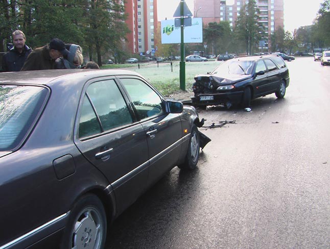 Štai Liepojos gatvėje "Mercedes Benz" trenkėsi į kelkraštį, automobilis apsisuko, lūžo ratas. Į jį dar trenkėsi "Renault Laguna".