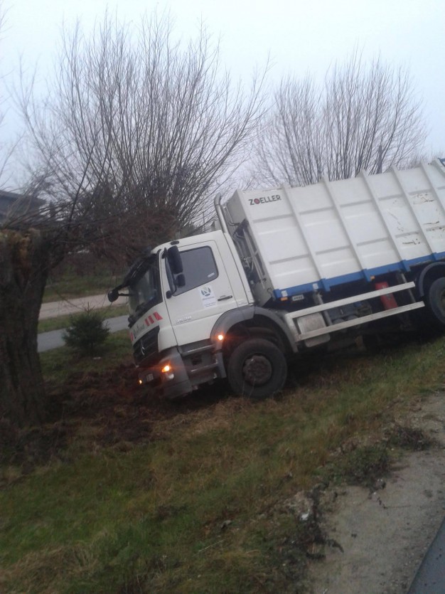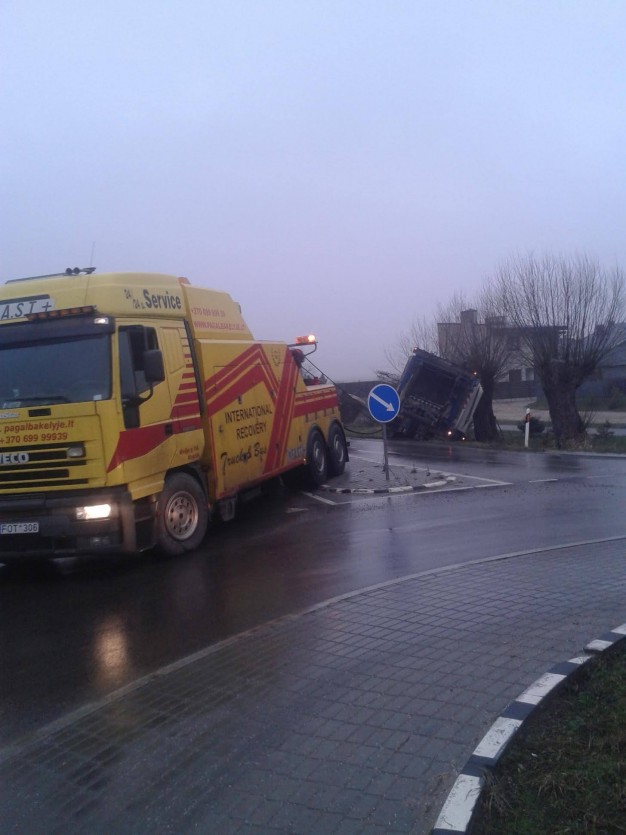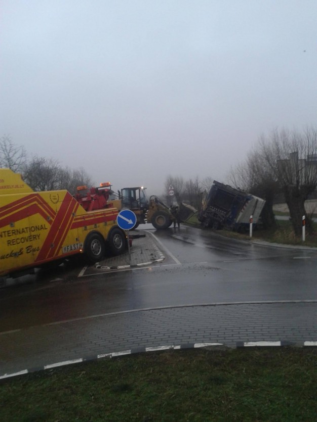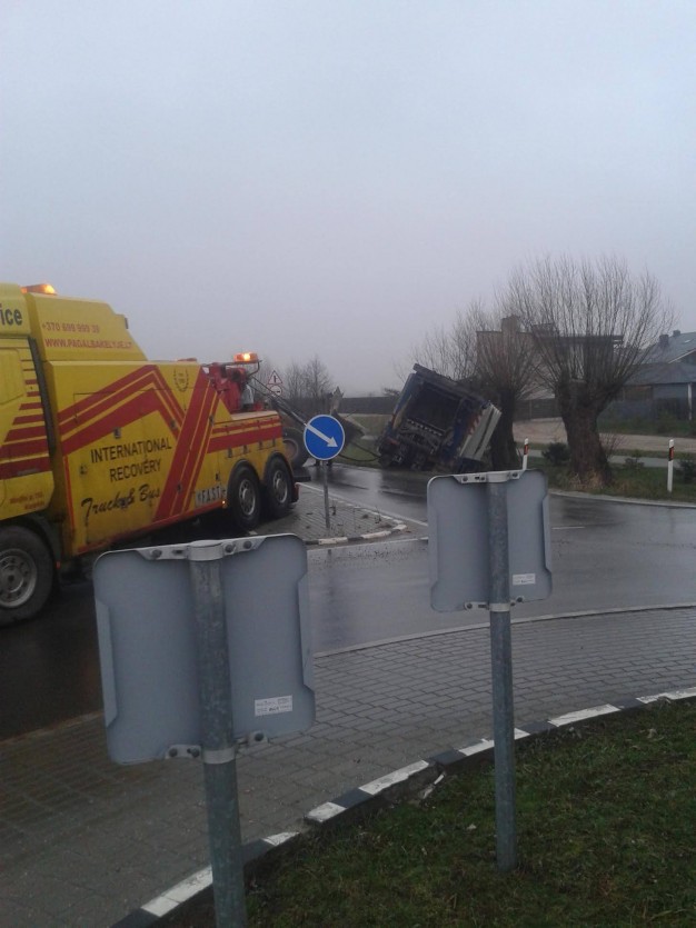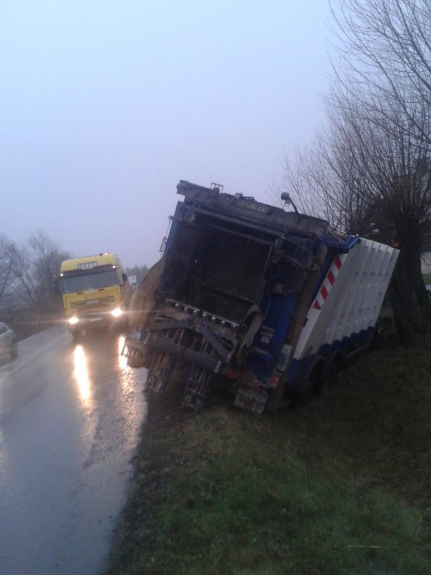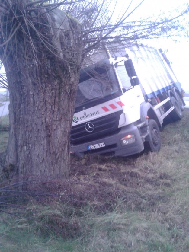 Apie pusė šešių ryto, Klaipėdos rajone, prie Gindulių ir Slengių žiedinės sankryžos, nuo kelio nuslydo šiukšliavežė.