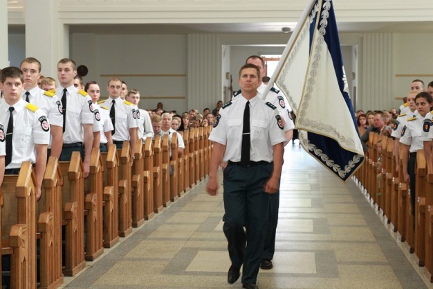 Prasidėjus ceremonijai, išsirikiavę iškilmingai rikiuotei kursantai laukė kuomet galės atiduoti pagarbą garbingiausiems šventės svečiams. Vėliau į bažnyčią įžygiavo vėliavų grupė, buvo giedamas Lietuvos Respublikos himnas.