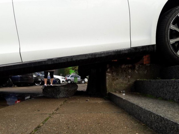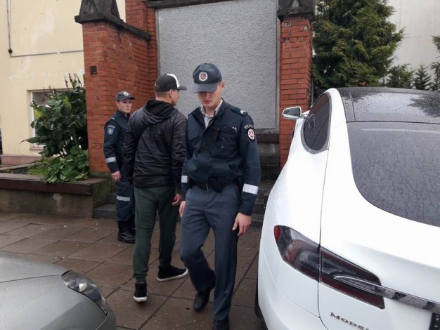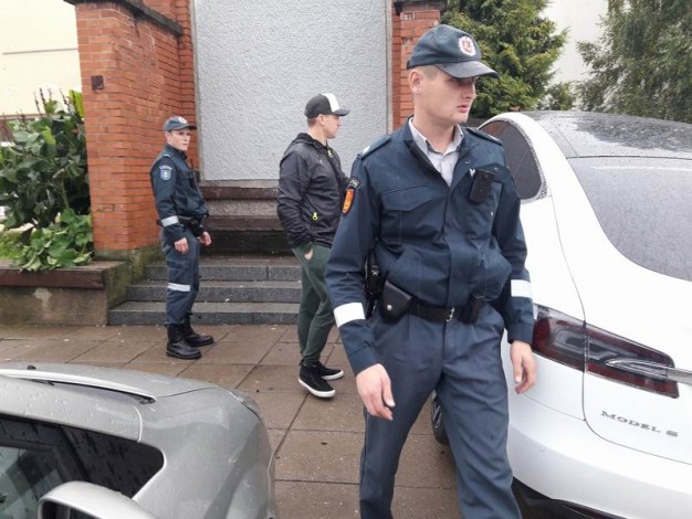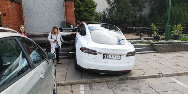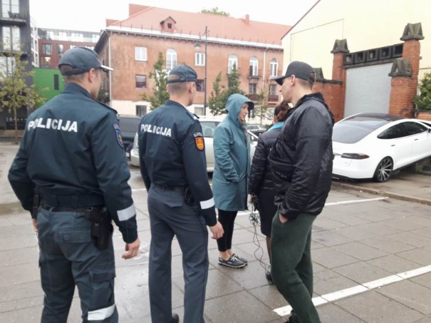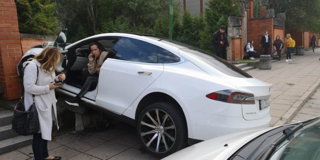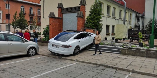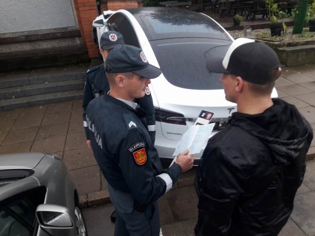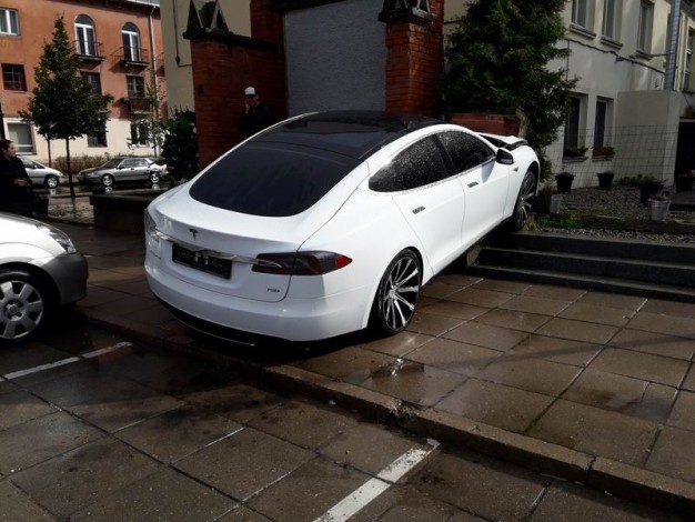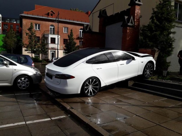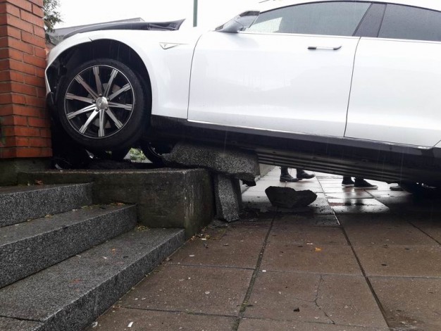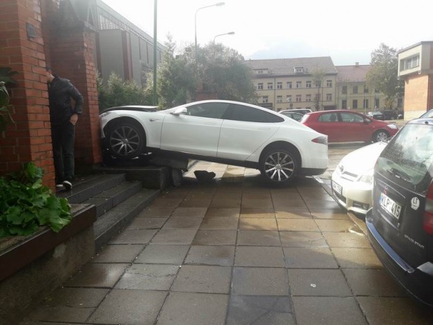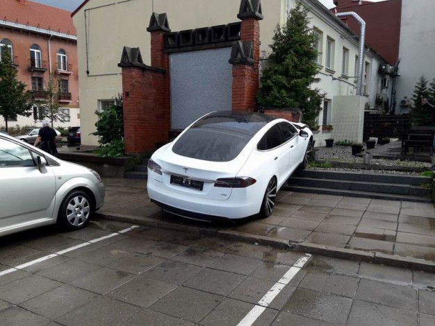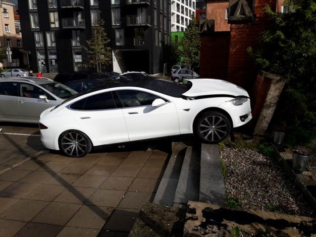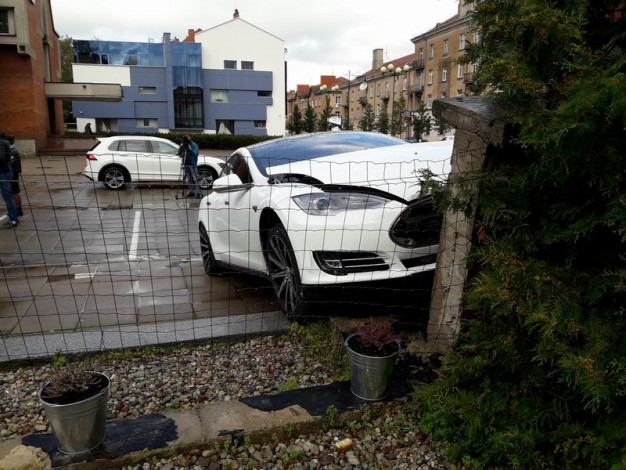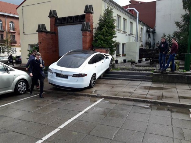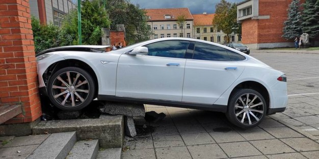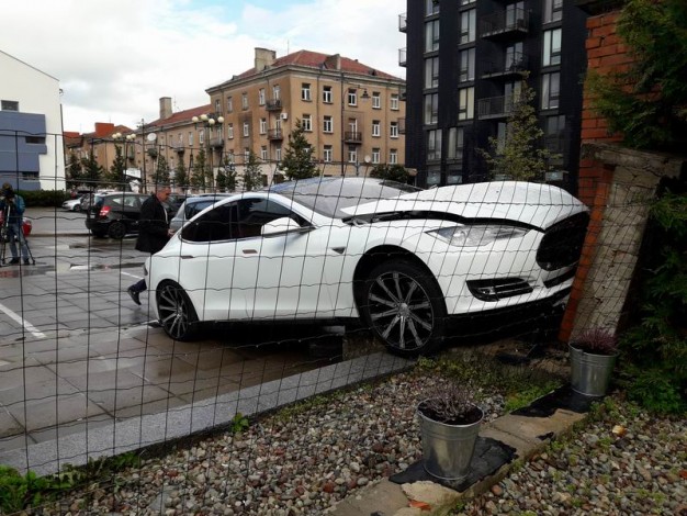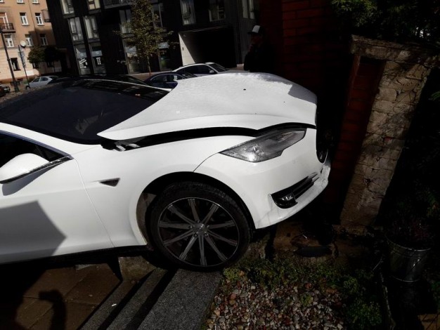 Antradienį perpiet Klaipėdos centre, ties Santuokų rūmais, įvyko keista autoavarija - 2016 metais pagamintas automobilis „Tesla“ „pabučiavo“ mūrinę tvorą.