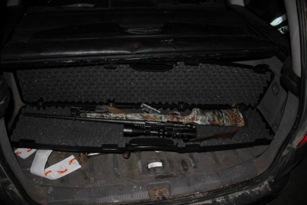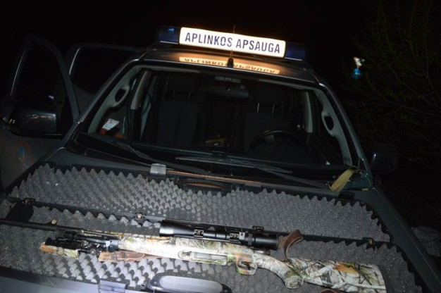 Inspektoriai sustabdė iš miško išvažiuojantį automobilį. Mašiną vairavo S.Č. (1988m. 01 mėn.), kartu važiavo D.J. (1987 m. 11 mėn.). Apžiūrėjus automobilį, bagažinėje buvo rastas plastikinis ginklo dėklas su medžiokliniu graižtviniu šautuvu „SAVAGE 3006“, su įstatyta dėtuve, kurioje buvo 3 šoviniai. D. J. pateikė leidimą lakyti, nešiotis ginklus ir galiojantį medžiotojo bilietą. Detalesnės automobilio apžiūros metu, buvo rastas naktinio matymo prietaisas, pritaikytas uždėti ant ginklo. Naktinio matymo prietaisus naudoti medžioklėje draudžiama, be to dokumentus pateikęs asmuo buvo neblaivus (0,2 prom.), o ginklo vežtis neblaivus asmuo neturi teisės, tad apie tai buvo informuota policija.