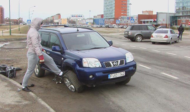 Automobilio "Nissan X-Trail" vairuotojas, išvažiuodamas iš šalutinio kelio, sukdamas į kairę pasibaidė kito automobilio, manevruojančio sankryžoje, trenkėsi į bortelį ir sugadino dešinės pusės ratą.