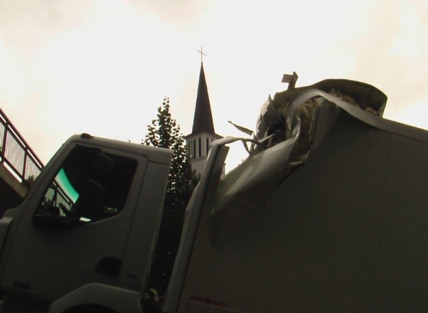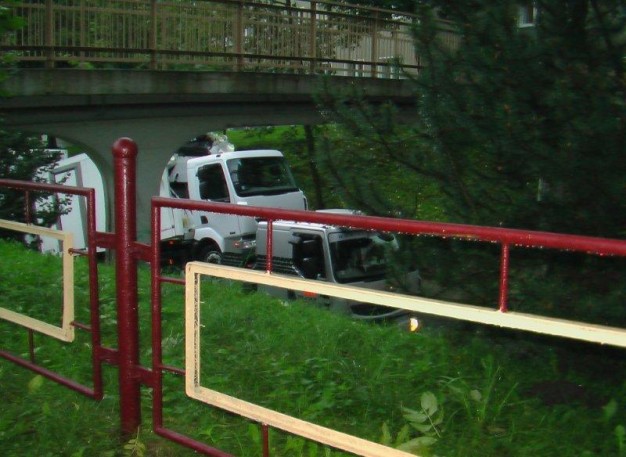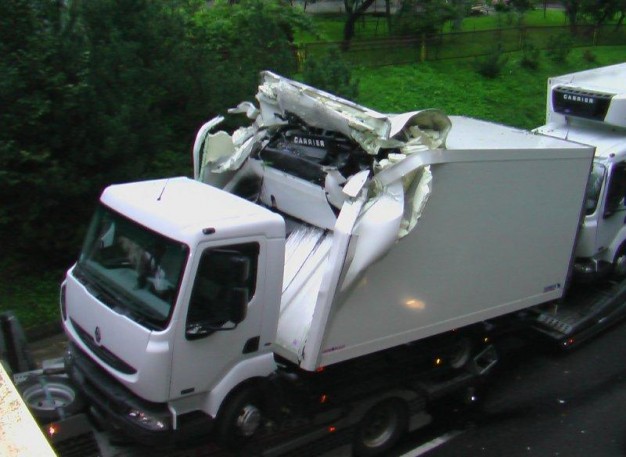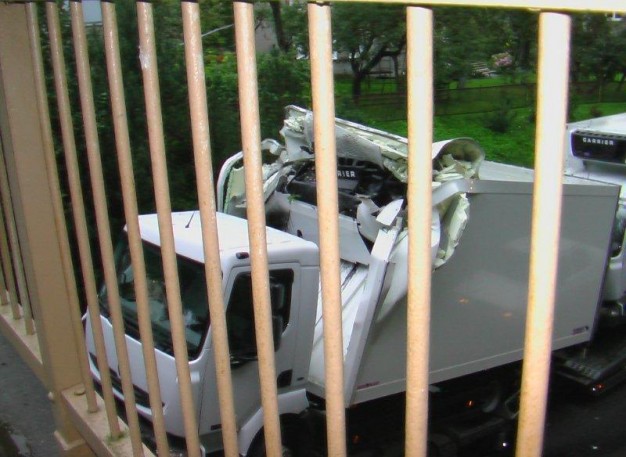 Tilto gatve Gargždų centro link važiavęs vilkikas "Renault Premium 410.19" buvo priverstas sustoti, kai jo tempiami du apynauji krovininiai automobiliai "Renault" atsitrenkė į ties miesto ligonine esantį pėsčiųjų viaduką.