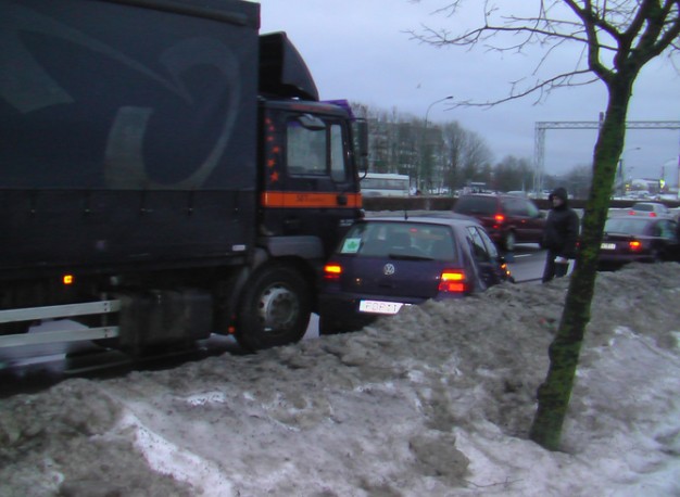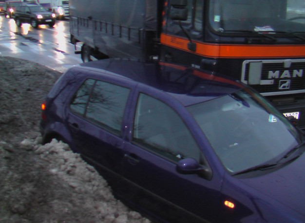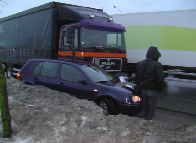 Į pirmą juostą persirikiuoti nutaręs sunkiasvorės transporto priemonės vairuotojas nepastebėjo golfo, taranavo jį ir prispaudė prie kietos sniego pusnies.