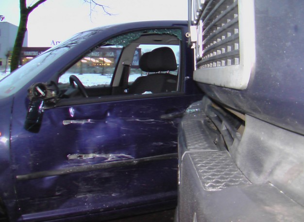 MAN trenkėsi tiesiai į lengvojo automobilio vairuotojos vietą, tačiau mergina nenukentėjo - po susidūrimo ji iš karto atsisegė saugos diržą ir peršoko į keleivio pusę.