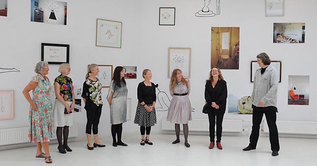 Dailės rūmų fojė žiūrovus pasitinka visų aštuonių menininkių bendras darbas, instaliuotas iš Klaipėdos psichiatrijos ligoninės baldų ir rekvizito.