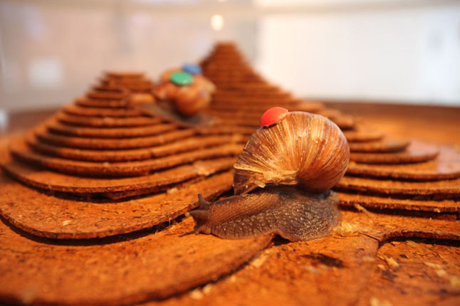 SRAIGĖS. Dmitrijus Bulatovas ir Aleksejus Čebykinas sukūrė bioaktyvią instaliaciją "Tai, kas gyvena manyje": po gaubtu šliaužiojačios gigantiškos afrikinės sraigės turėtų perteikti metaforą apie kiaukutą-namą.