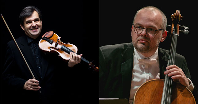 Smuikininkas Raimondas Butvila ir violončelininkas Mindaugas Bačkus.