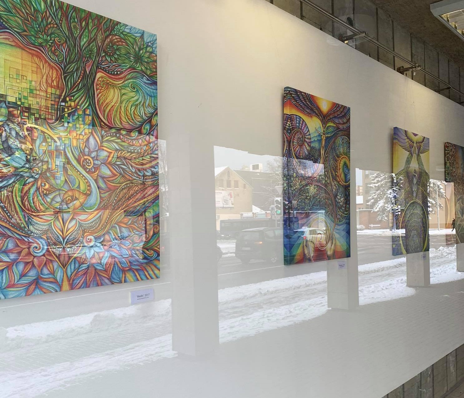Šešerius metus keliavusi po pasaulį piešinius kūrėja pristatė ir tarptautiniuose festivaliuose, juose piešė gyvai ir taip dalijosi gydomuoju meno poveikiu. Parodai atrinktus kūrinius vienija gamtos tema: juose dominuoja augalų, saulės ir vandens motyvai. Menininkės darbų išskirtinumą kuria pasikartojantis rankų motyvas, kuris menininkei lyg širdies pratęsimas. „Rankos simbolizuoja žmogų, kaip neatskiriamą gamtos dalį, jo integralią būtį visuose esančiuose elementuose ir kiekvienoje būsenoje vyraujančią skirtingą nuotaiką, kurią sustiprina kuri nors dominuojanti spalva“, – taip eksponuojamų kūrinių esmę apibūdina menininkė.