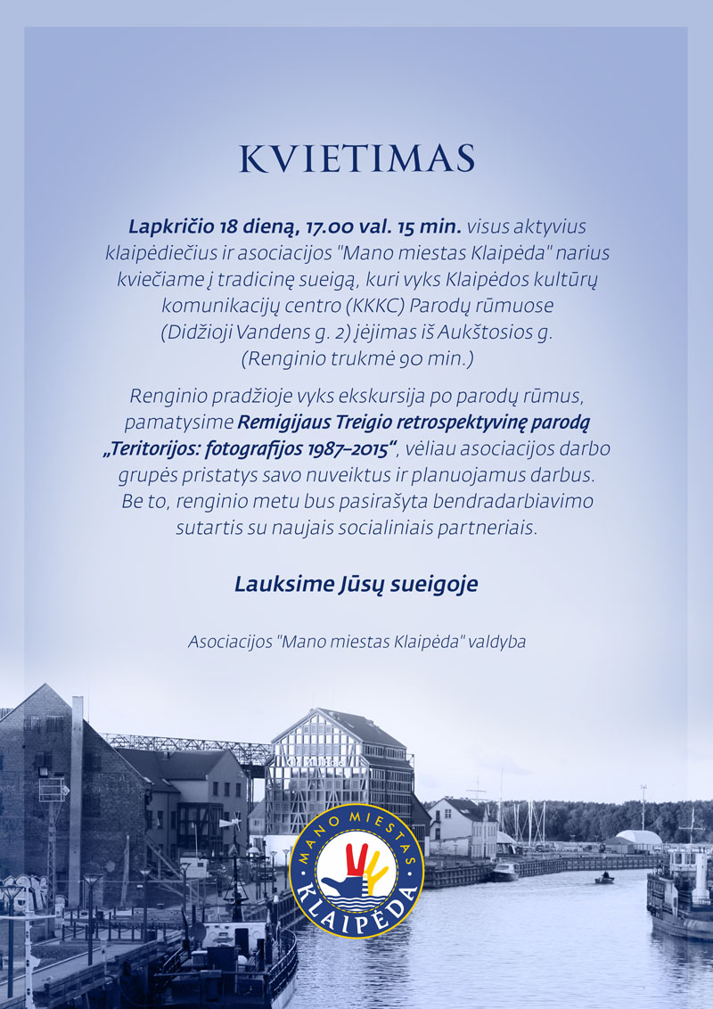 Lapkričio 18 dieną, 17.00 val. 15 min. visus aktyvius klaipėdiečius ir asociacijos "Mano miestas Klaipėda" narius kviečiame į tradicinę sueigą, kuri vyks Klaipėdos kultūrų komunikacijų centro (KKKC) Parodų rūmuose (Didžioji Vandens g. 2) įėjimas iš Aukštosios g. (Renginio trukmė 90min.) Renginio pradžioje vyks ekskursija po parodų rūmus, pamatysime Remigijaus Treigio retrospektyvinę parodą „Teritorijos: fotografijos 1987–2015“, vėliau asociacijos darbo grupės pristatys savo nuveiktus ir planuojamus darbus. Be to, renginio metu bus pasirašyta bendradarbiavimo sutartis su naujais socialiniais partneriais.