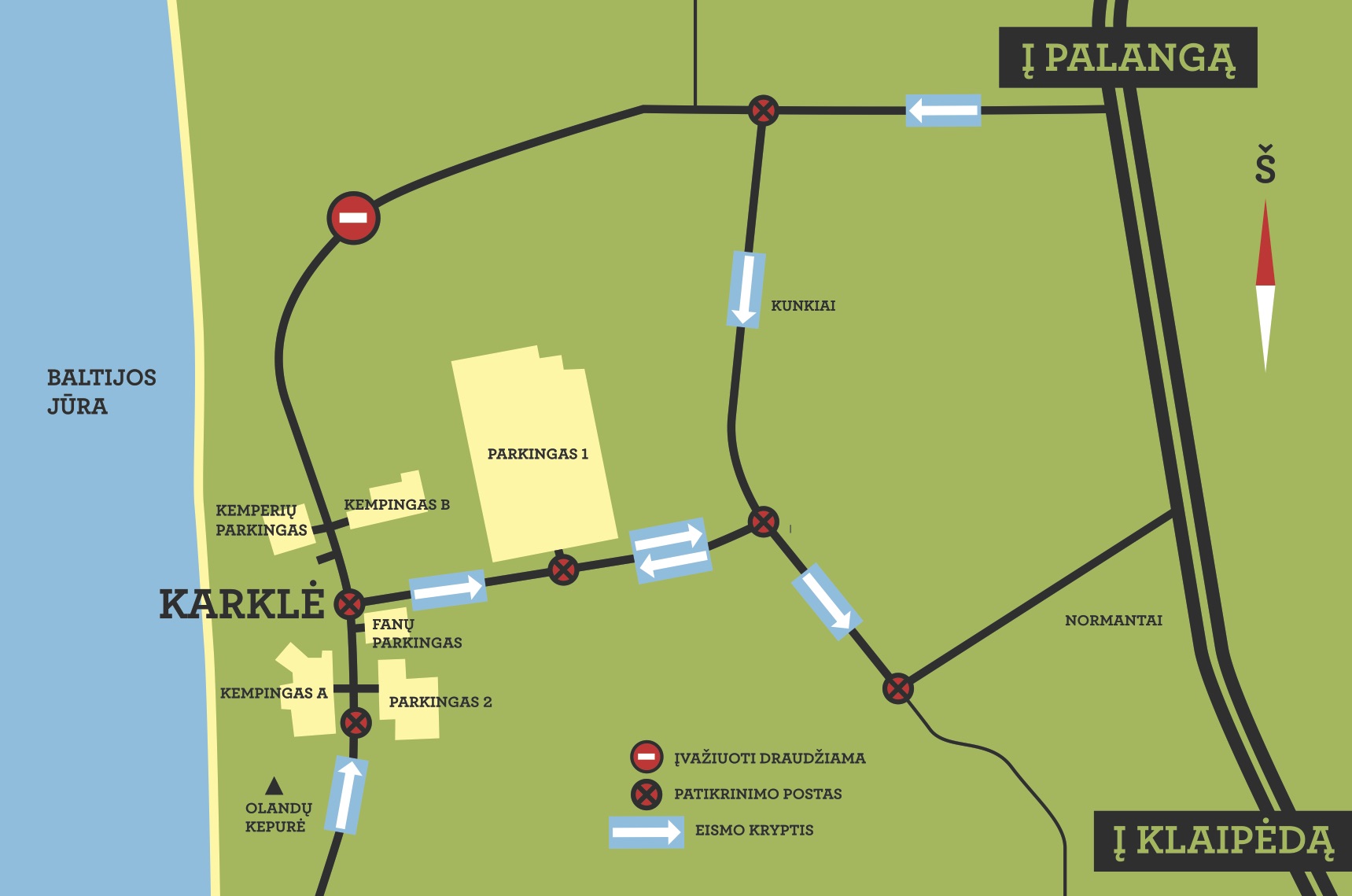 Reikėtų atkreipti dėmesį, kad eismas link festivalio teritorijos nuo Palangos plento bei keliu Klaipėda-Dargužiai-Karklė organizuojamas viena kryptimi.