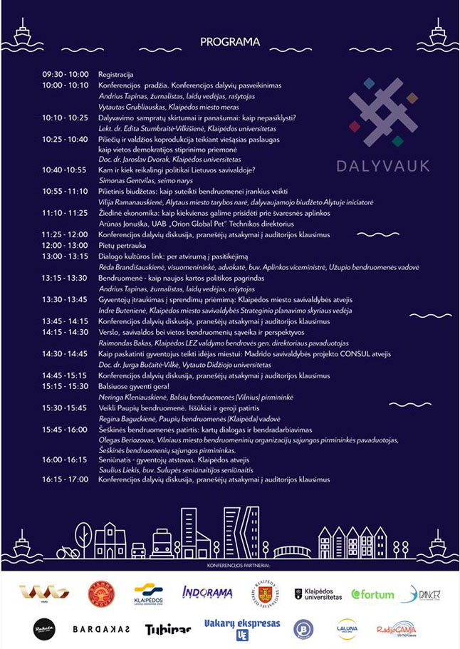 Klaipėdos Bendruomenių asociacija ir asociacija „Mano miestas Klaipėda“ kviečia į konferenciją DALYVAUK – ir tai tik pirmas žingsnis link viešo ir pilnaverčio dialogo tarp vietinio verslo, bendruomenės, valdžios. Renginio metu bandysime užčiuopti pradines visų trijų dialogo dalyvių pozicijas miestui svarbiais klausimais, dalyvaujamosios valdysenos ir dalyvaujamojo biudžeto taikymo
