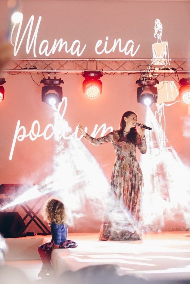Renginį „Mama eina podiumu“ vedė žodžio virtuozai Remigijus Žiogas ir Vilius Regalas. Savo dainomis publiką džiugino aksominio balso atlikėja Ieva Zasimauskaitė.